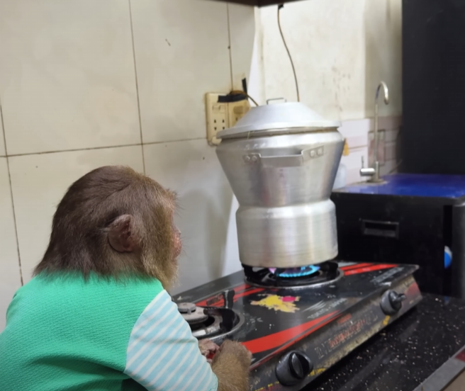 The kitchen came alive with excitement. CUTIS wore a small apron — far too big for him, so it dragged on the floor — and tied a little cloth around his head like a chef. He looked both adorable and determined.