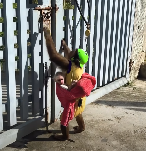He reached the gate of the small veterinary clinic. Through the fence, he could see a few people and animals. A kind nurse noticed the two monkeys standing outside and came closer. CUTIS tilted his head, his eyes pleading.