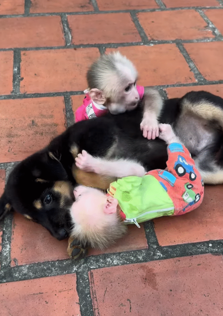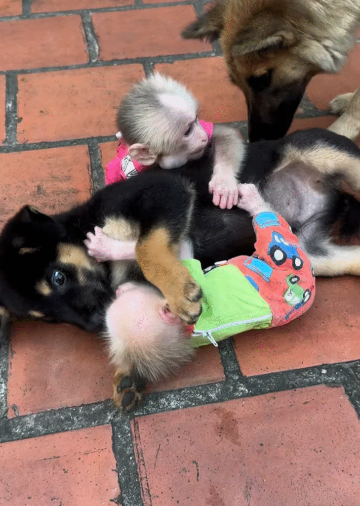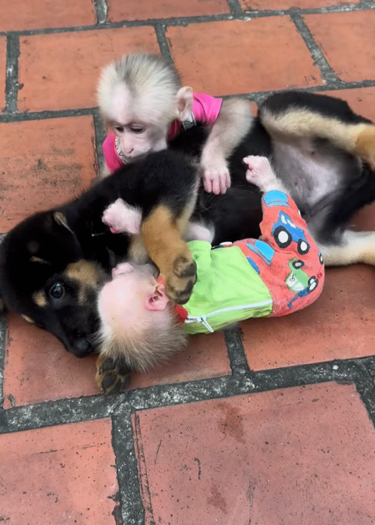 And in that quiet, cozy room, the three friends — a girl, a monkey, and a dog — dreamed of another golden afternoon filled with laughter, friendship, and another round of joyful wrestling in the sunshine.
