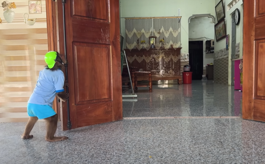 Later that day, CUTIS noticed Mom struggling to sweep the floor. So he whispered to Baby Monkey again, “Next mission — we clean the house!”