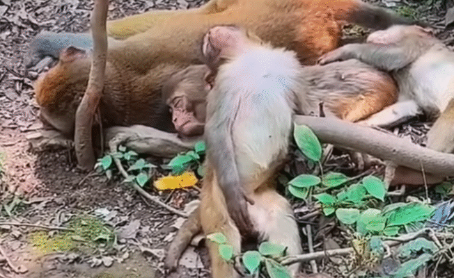 The afternoon sun filtered softly through the green canopy, painting golden patches on the forest floor. The air was warm, and the forest hummed with a peaceful rhythm. Birds chirped lazily from distant branches, and the rustle of leaves whispered like a lullaby. It was the perfect time for a nap — and for one small monkey family, that meant gathering together for their favorite part of the day: the family nap.