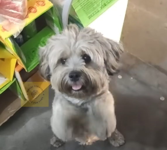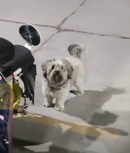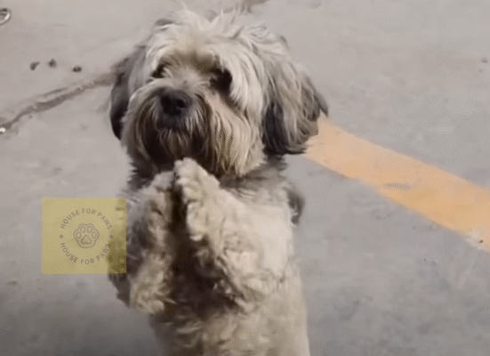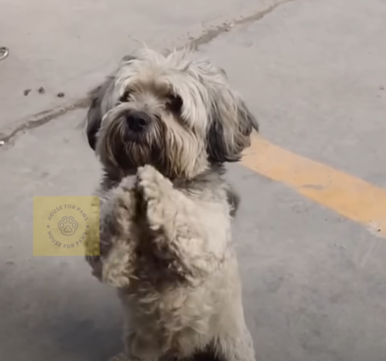 Every time a person passed by, the dog lowered his front paws, bent his head toward the ground, and looked up at them — as if he was pleading. His small body trembled slightly, his tail wagged weakly. It was the only language he had left: a humble, silent plea for kindness.