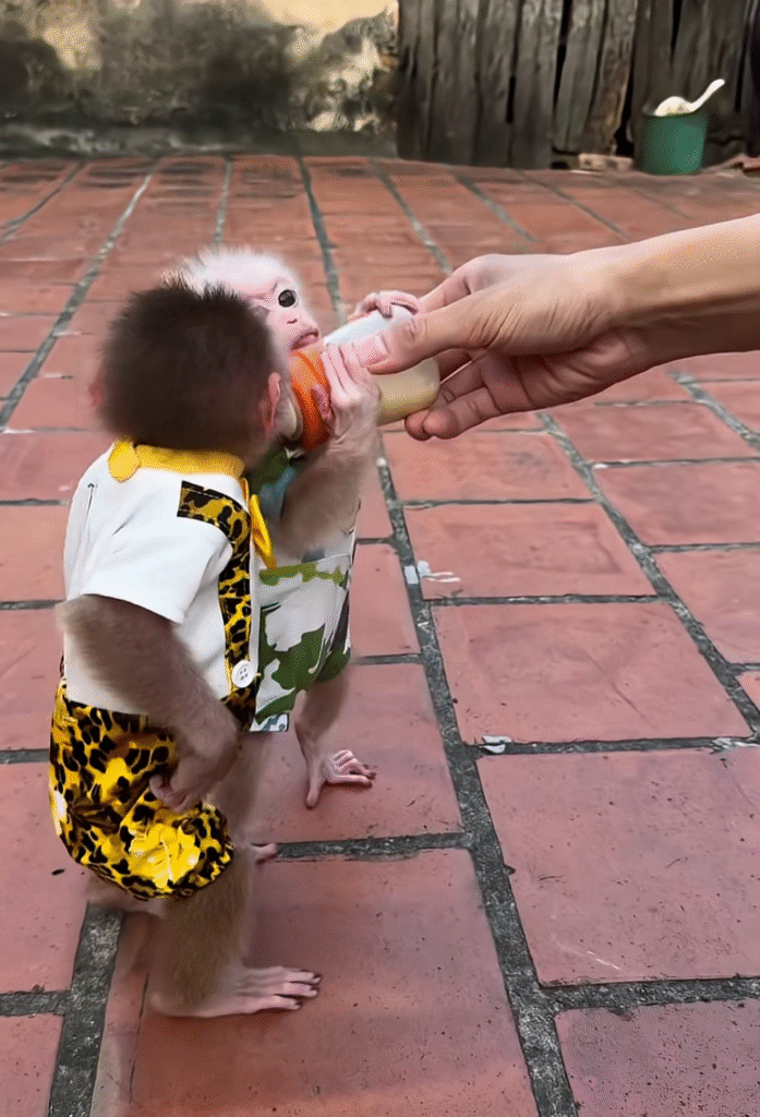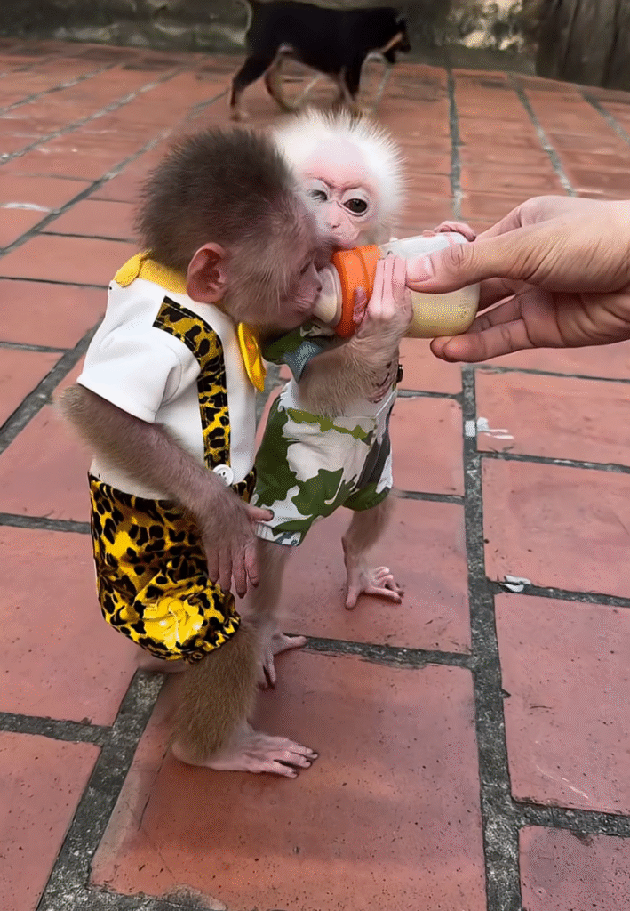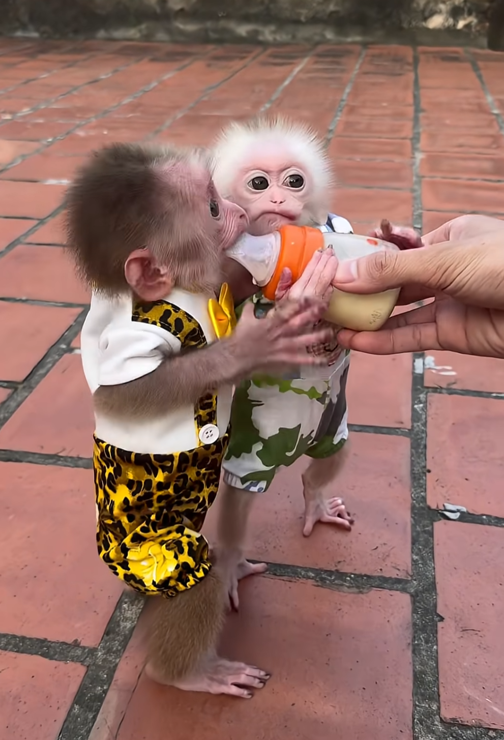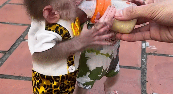 The morning sun peeked through the soft leaves, bathing the small courtyard in golden light. Little Kimi, the baby monkey, was still half-asleep, curled up on a cozy blanket that smelled like her dad. Her tiny hands clutched the edge of the fabric as she dreamed of something sweet—warm milk and soft cuddles. Suddenly, she heard a familiar sound: the soft squeak of a bottle cap twisting open.