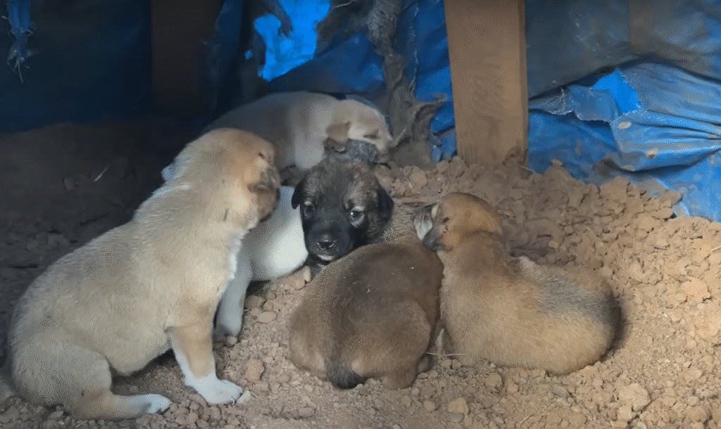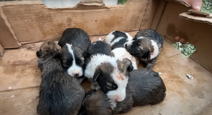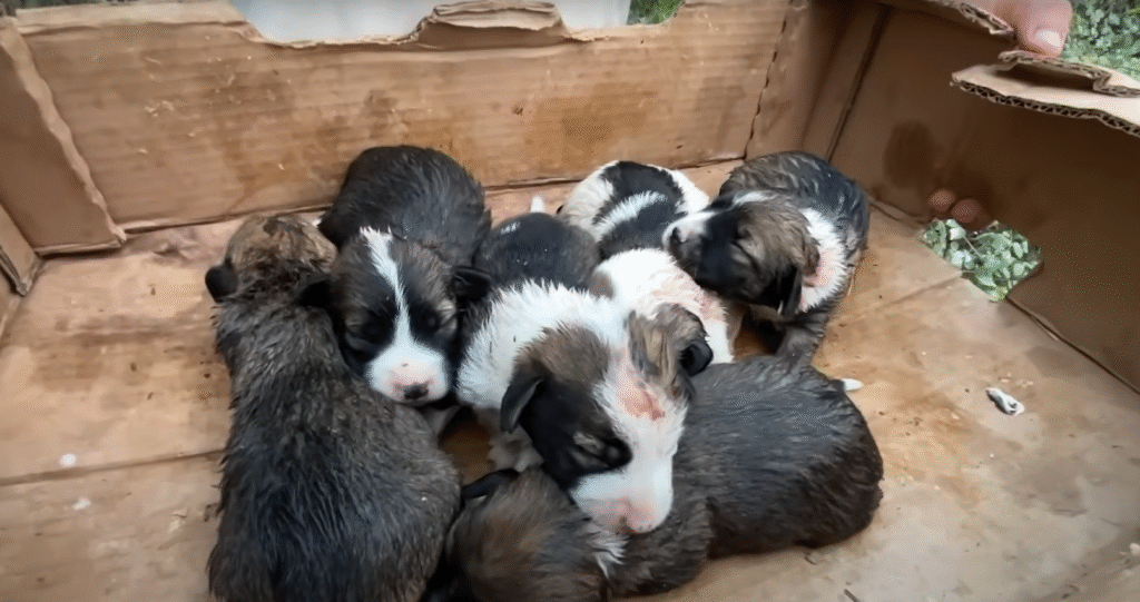 There, beneath a tangle of fallen branches and leaves, lay a small cardboard box. It was half-collapsed, soaked from previous rains, and inside it were four tiny puppies, their fur dirty and matted, crawling over each other weakly.