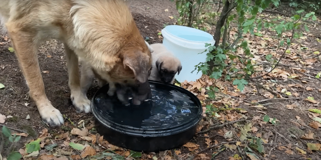 Then she looked up at her puppies, her tongue dripping with water, her eyes soft but expectant — as if to say, “See? Like this, my babies.”