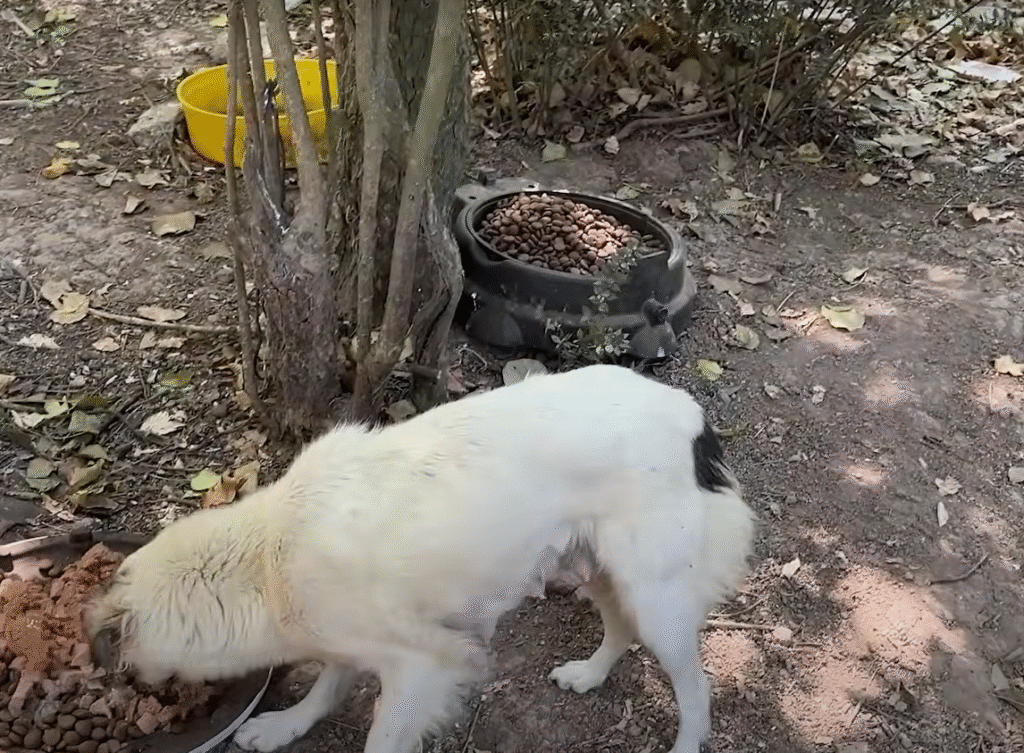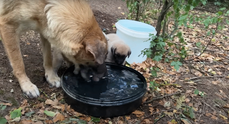 The puppies are bigger now, playful and energetic, chasing butterflies and wrestling with each other under Luna’s watchful gaze. They drink from their bowl without hesitation, confident and happy. But every now and then, when they finish, they still look up at Luna, as if remembering that first day — the day she showed them not just how to drink water, but how to live, learn, and love.