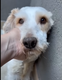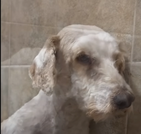 When rescuers first saw him, he was hiding behind an old rusted gate, his body pressed against the cold wall as if he wanted to disappear. His fur was filthy and matted, his ribs painfully visible, and his eyes — those deep, frightened eyes — told a story of betrayal that words never could.