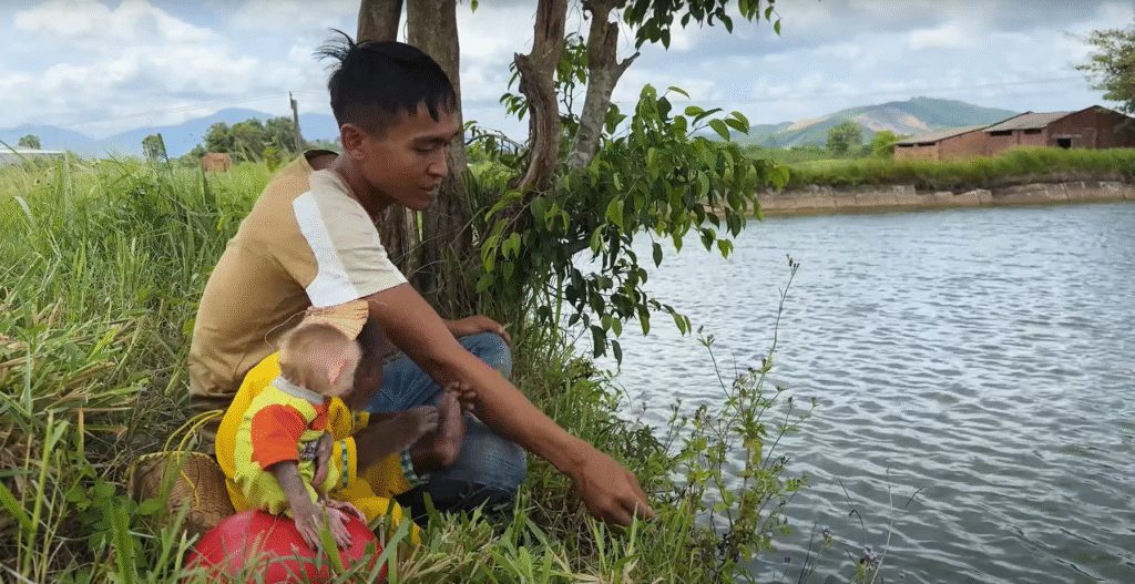 The river glistened invitingly, the water reflecting the bright morning sun in ripples that danced across its surface. CUTIS carefully positioned himself at the water’s edge, crouching low, his small hands gripping the fishing rod tightly. The first few attempts were clumsy, as expected from a novice, and the line kept slipping or tangling in the reeds. But CUTIS was determined. With patience that belied his young age, he cast the line once more, and this time, there was a tug!