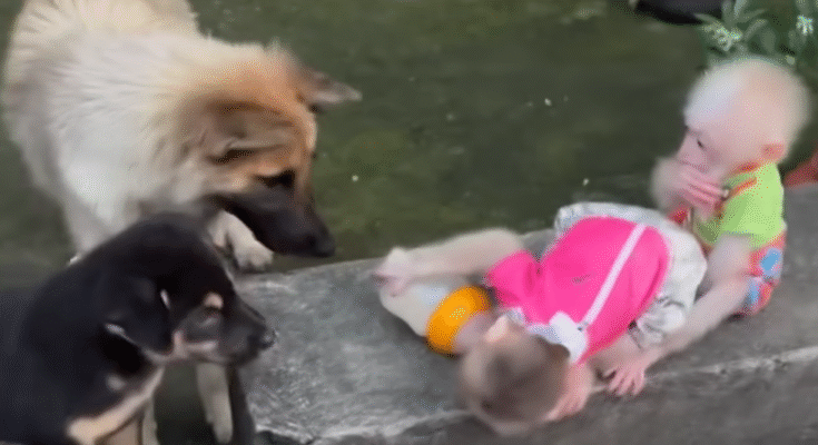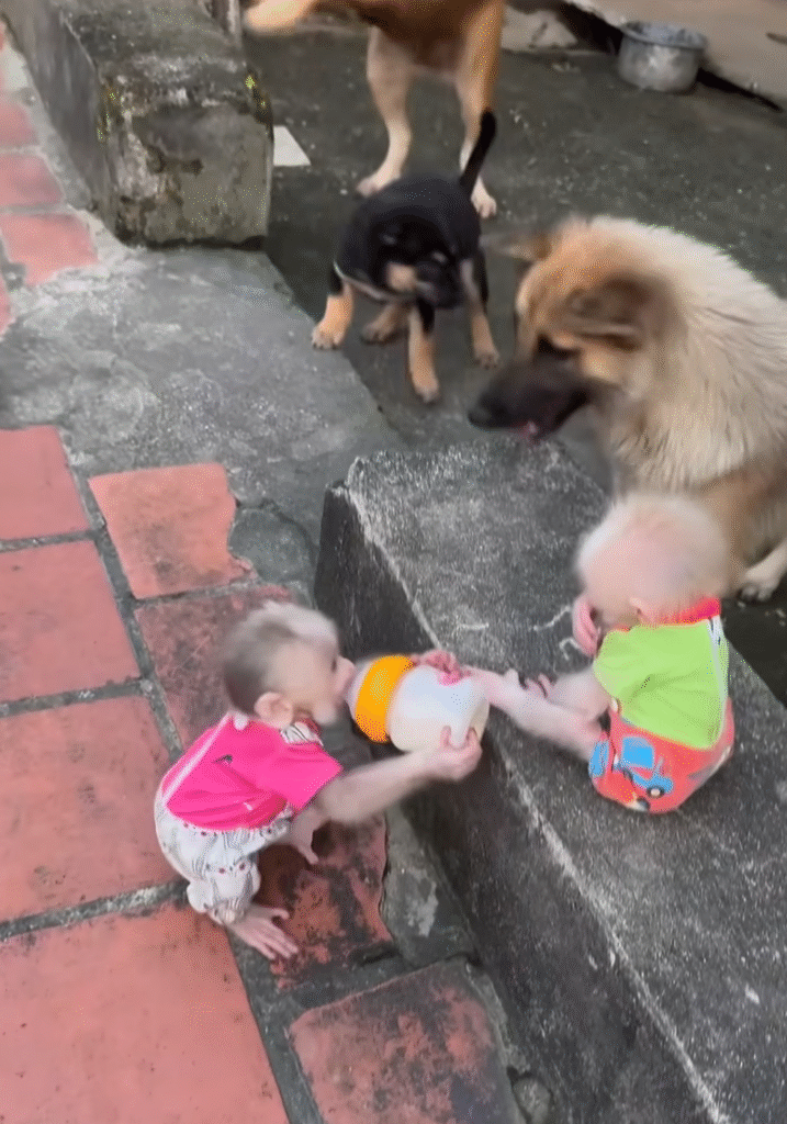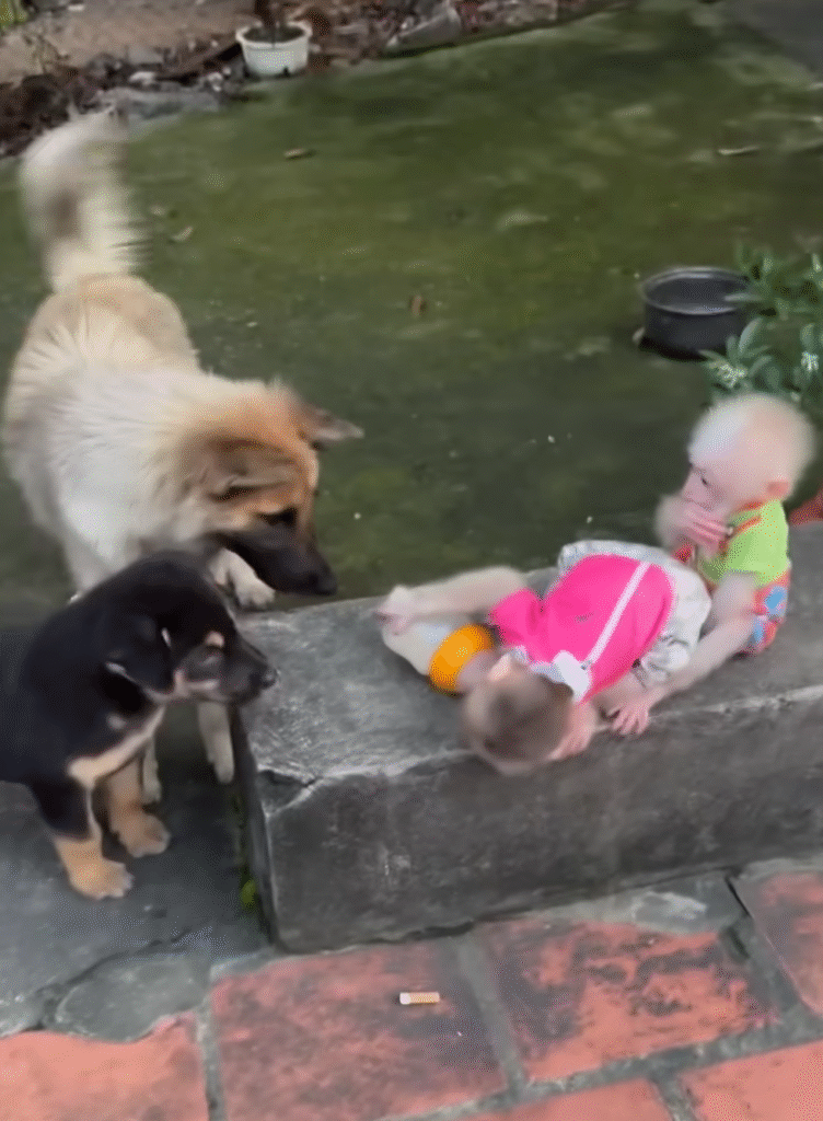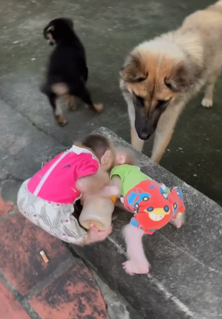 Kevin tried to climb onto the stump, but Brownie was faster. The dog stood up on his hind legs and gently tugged the bottle from Kevin’s little hands. He didn’t bite or growl—he just took it carefully and placed it back next to Sumi.