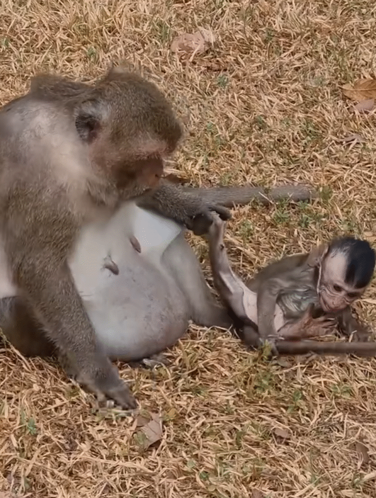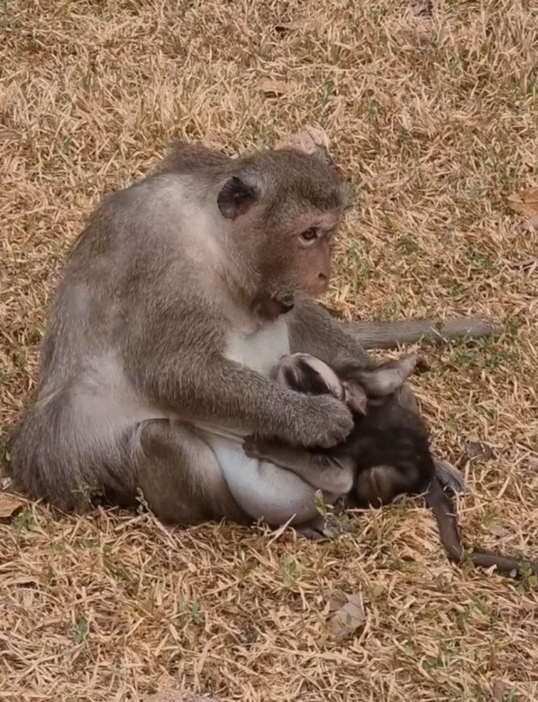 distant birdsong. Among the tall trees and soft rustling leaves, a tender scene unfoldedâone that could melt any heart. A mother monkey sat quietly on the soft grass, holding her tiny baby close to her chest. Her eyes, full of deep affection, gazed down at the little one who squirmed and cooed softly.
