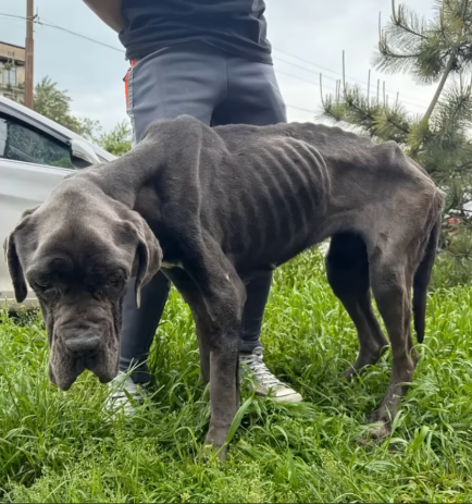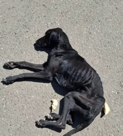 The sun had barely risen when traffic began to flow on the dusty roadside. Amid the noise of honking and the rush of engines, a frail figure stood by the curb—a skinny dog, trembling, ribs visible beneath her patchy fur. Her eyes followed every car that passed, her tail wagging weakly as if she was silently pleading, “Please, stop. Please, give me a chance to live.”
