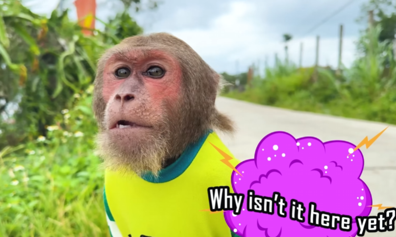 But the moment he tried to stand up, the carrier tipped over, sending him tumbling onto the floor with a loud thud! Baby Monkey squeaked, “CUTIS! Are you okay?!”