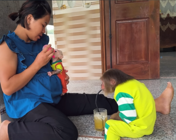 Before anyone could stop him, Baby Monkey grabbed the bottle and tried to suck from the nipple. His face scrunched up in confusion. “Hmm… it tastes weird. Like banana water but not banana.”