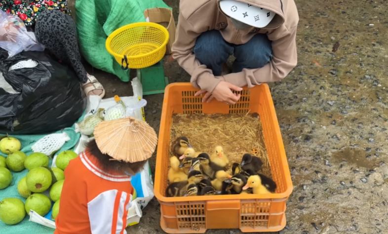 Just then, Mom appeared, holding a basket of fruits. She had been watching from a distance, her heart swelling with pride. Seeing CUTIS and the baby monkey work so hard to help the ducks touched her deeply. She walked over, knelt beside them, and gently patted their heads.
