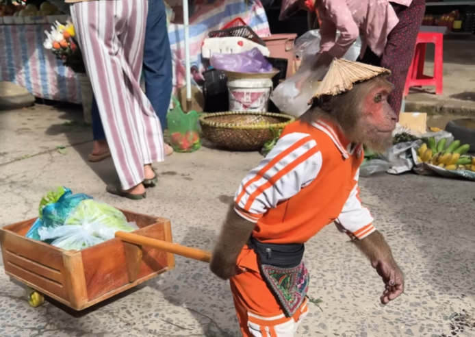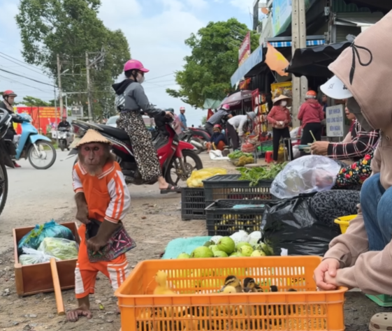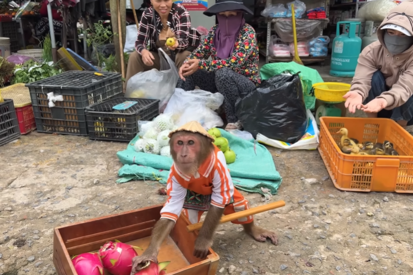 CUTIS squealed happily and hugged Mom’s leg, his fur still damp. The baby monkey clapped, pointing toward the ducks as if proudly saying, “We did it together!” Mom laughed and handed them each a juicy mango as a reward.