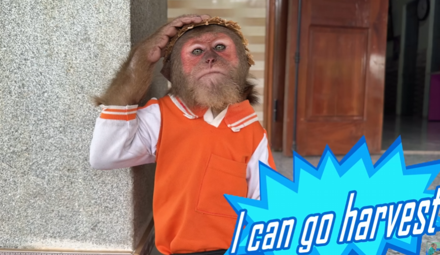 The morning sun shimmered across the quiet farm, casting golden reflections on the gentle ripples of the pond. Dew still clung to the grass, and a soft breeze carried the sweet scent of blooming flowers. CUTIS, the clever little monkey, woke up earlier than usual. He rubbed his sleepy eyes and stretched his tiny arms, glancing around to check if everyone was awake. Beside him, the baby monkey—his curious and energetic companion—was already sitting up, munching on a piece of banana and humming happily.