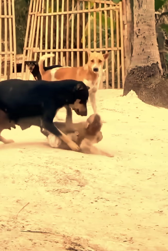Without thinking, Mimi leapt from the fence, landed on a tree branch, and began screaming and waving her arms. She grabbed small mangoes and threw them with surprising aim. The sudden attack from above startled the stray dogs.