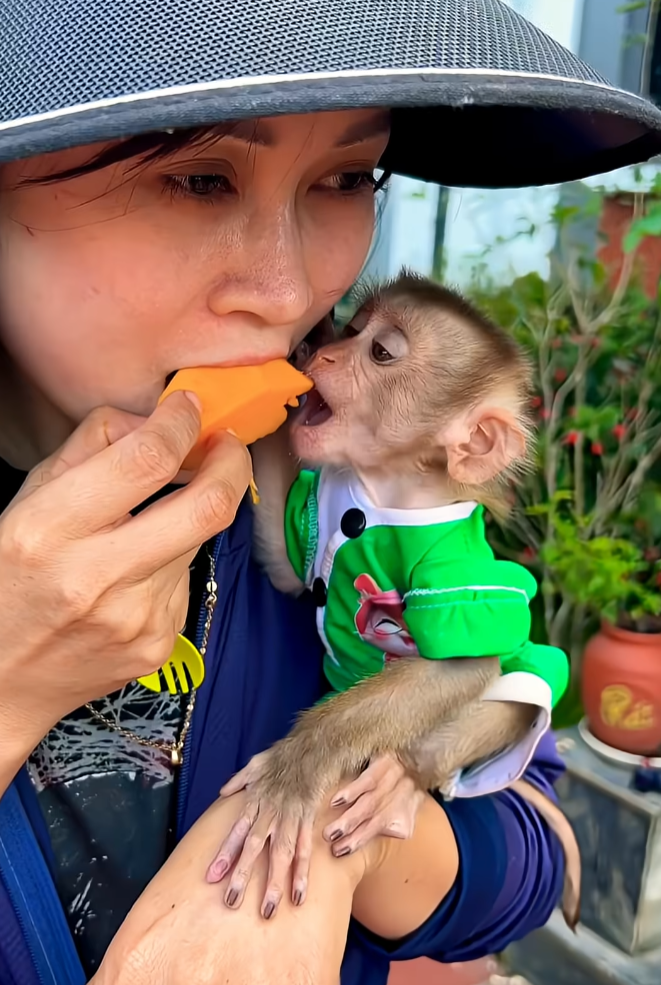 She jumped down gracefully and picked up a ripe mango. When she returned, she tore off a small piece and handed it to Xuxu. The baby monkey took it, giggling in delight, and bit into the soft fruit.