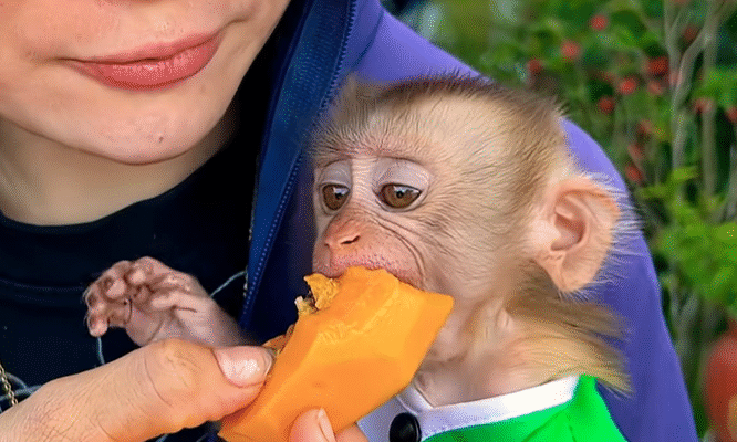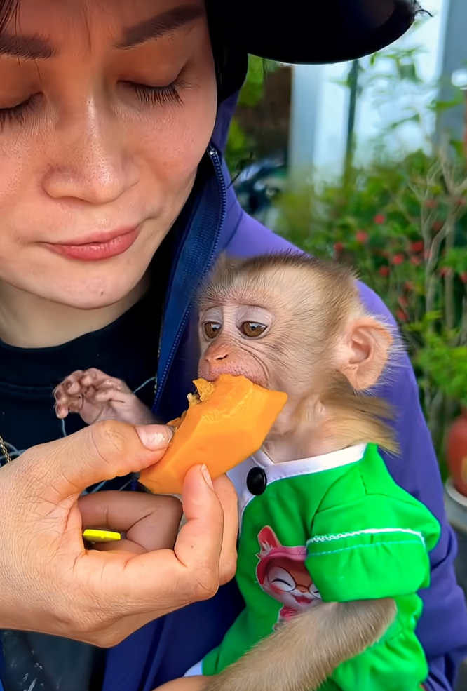 But Xuxu didn’t care. She licked her fingers happily, completely lost in her fruity feast. When she was done, she leaned against her mother’s chest, full and content.