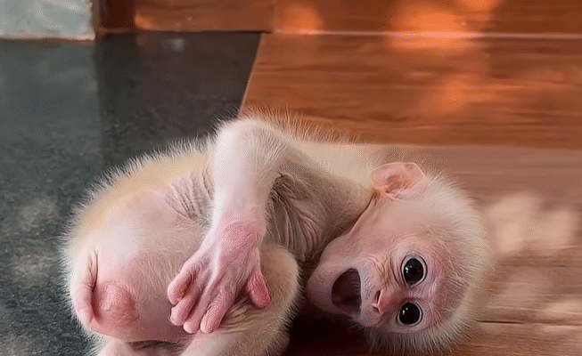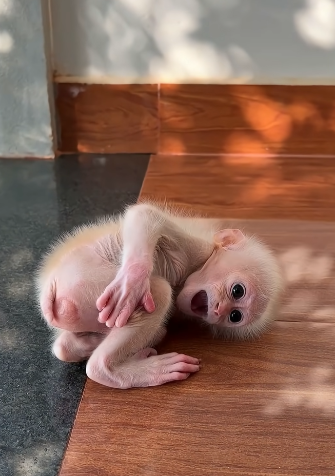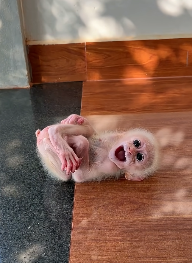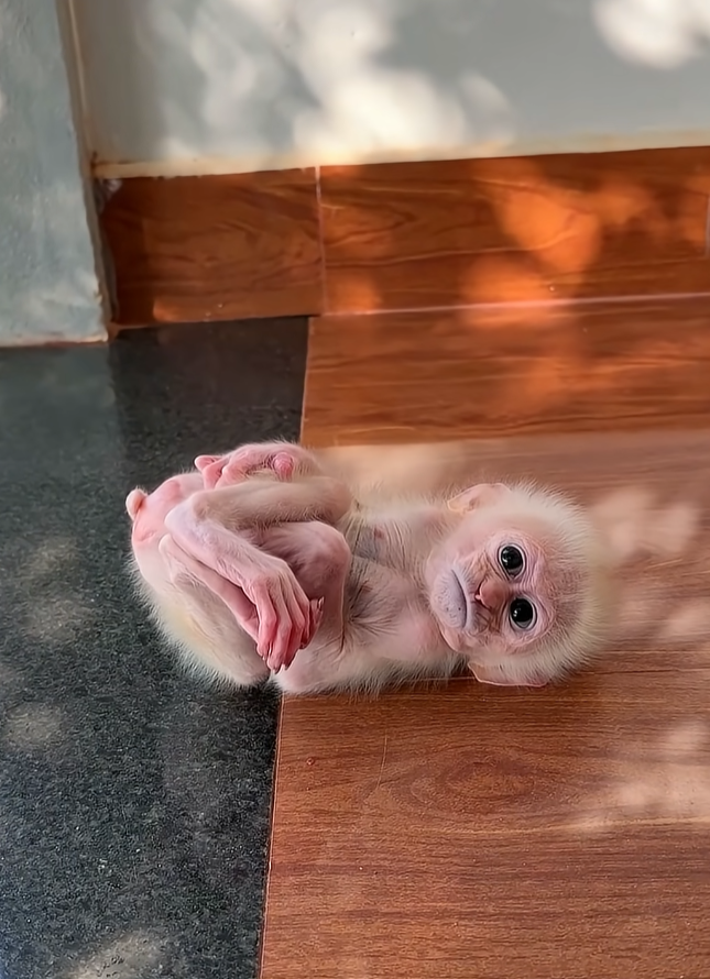 The golden morning light streamed softly through the window, casting warm patches across the floor. In one of those sunny spots lay a tiny baby monkey — small, pink-faced, and full of life. Her name was Mimi, and she had just discovered the joy of laughter.