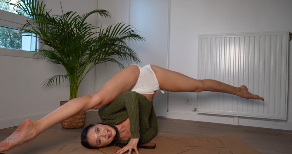 Switching sides, she mirrors the sequence with perfect control, her voice guiding viewers through the movements with clarity and compassion.