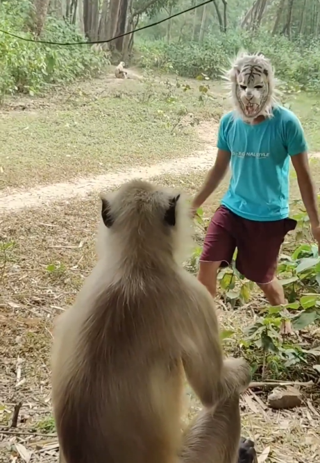 Bubu, still full of energy, decided to alert the troop of a “dangerous predator” he imagined. He ran from branch to branch, squealing loudly. “Tiger! Tiger! Everyone watch out!”