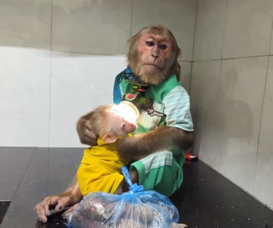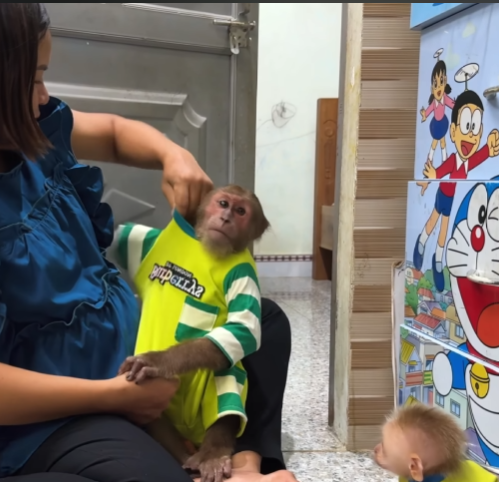 Back at the house, Mom noticed the baby monkey sitting by the window, eyes wide with curiosity. “What’s wrong, little one?” she asked with a smile.