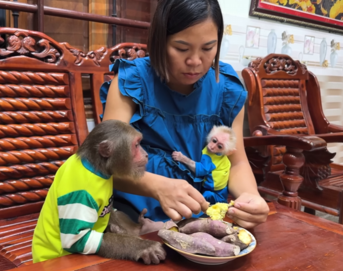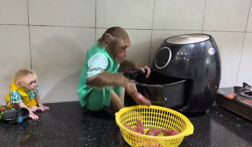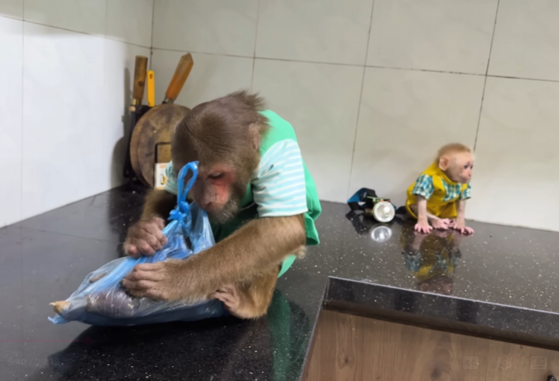 The baby monkey grabbed a banana from the basket and tried to peel it upside down, making both of them laugh. CUTIS helped him, still grinning.
