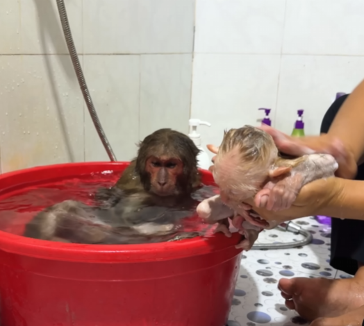 The baby monkey squealed and hugged CUTIS tightly, then clambered up onto Mom’s shoulder, patting her belly as if saying, See, we told you it was special!