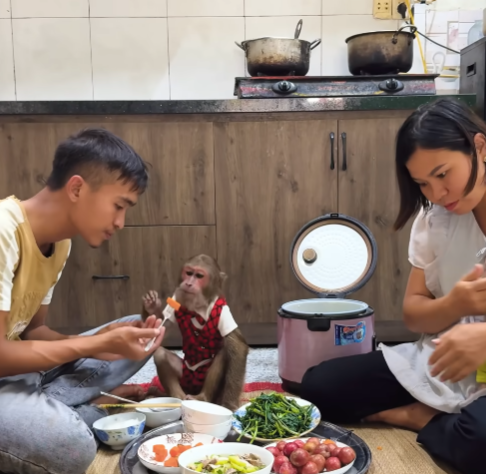 When the food is finally ready, CUTIS doesn’t rush. Instead, he lets the baby monkey eat first, keeping a protective eye on him. If the monkey drops a piece of banana, CUTIS picks it up and gives it back. Sometimes, they even share from the same plate, sitting side by side like two siblings who’ve known each other forever.