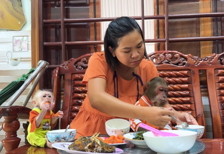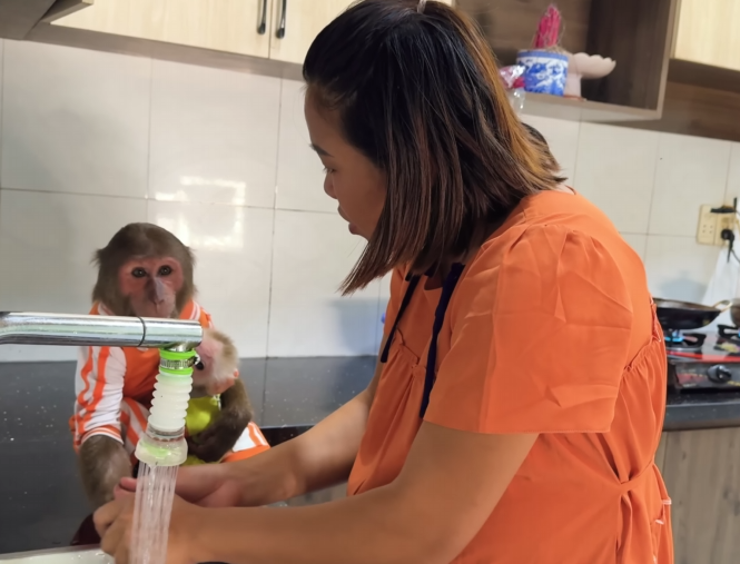 Yen Nhi, Mom, and baby monkey were watching from a distance, hiding behind a tree. They whispered in disbelief.