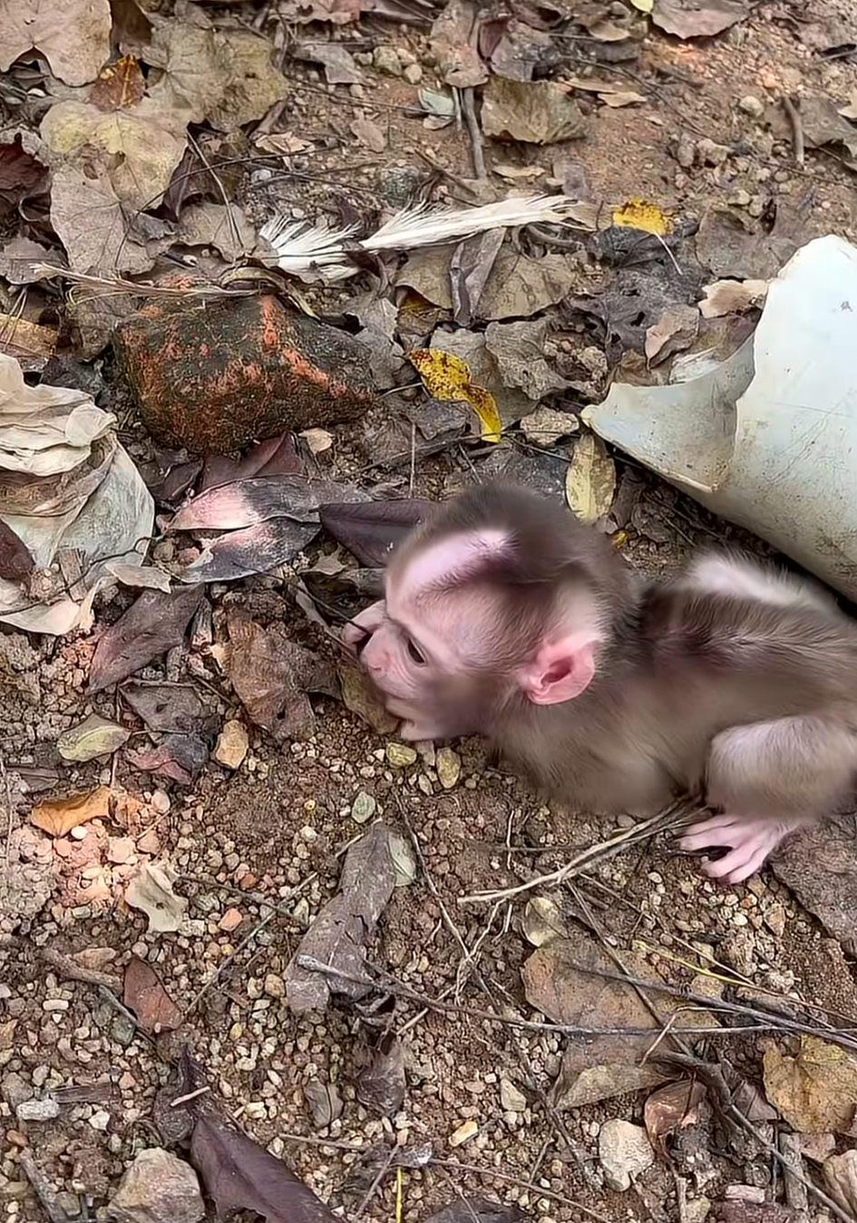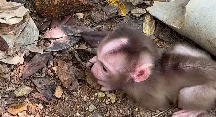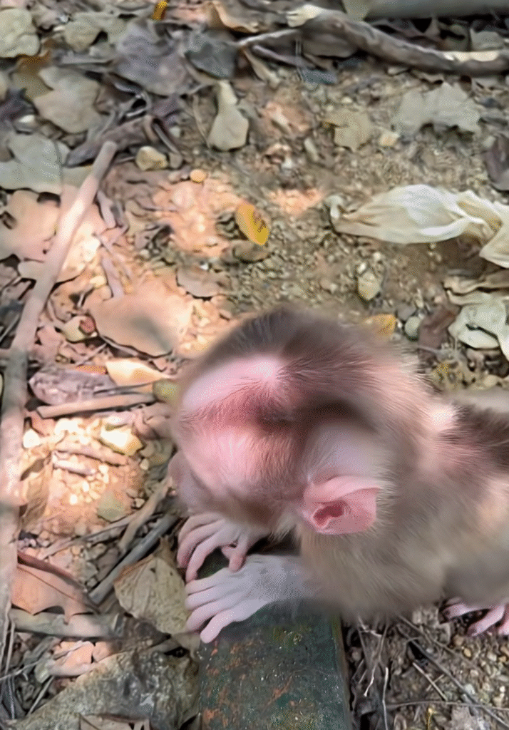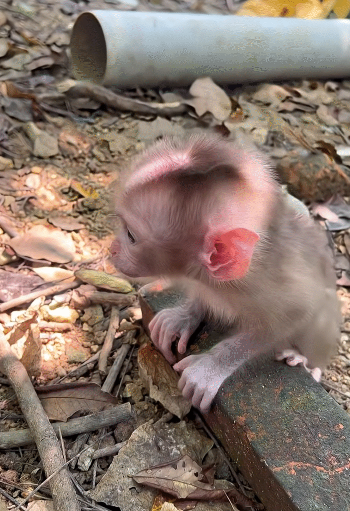 After eating, Momo continued to explore. He found a small patch of sand and pressed his hands into it, leaving tiny handprints. He touched everythingâthe bark of a tree, the fallen leaves, even a line of ants marching along a stick. When one ant climbed onto his finger, he squeaked in surprise and shook it off, his little heart racing. His mother chuckled softly.