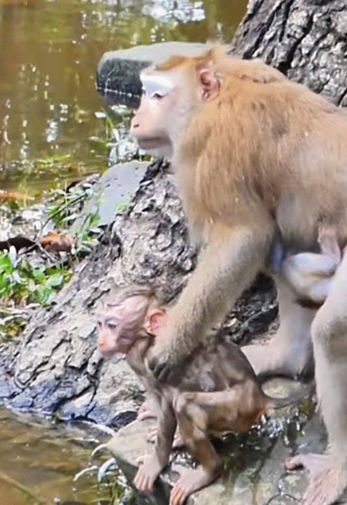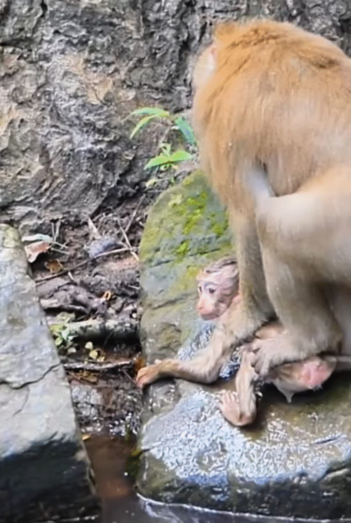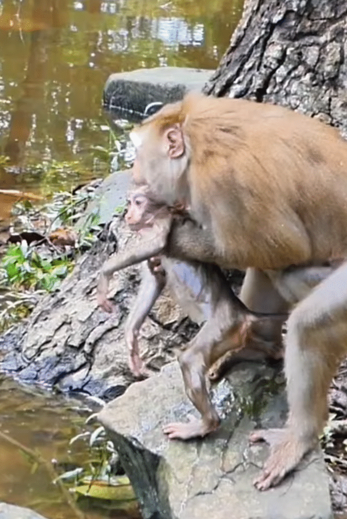 After a few minutes, the mother monkey carried Nunu away from the water, settling on a dry patch of ground beneath a tall tree. She sat down and cradled him in her arms, inspecting him carefully. Every mother checksâears, arms, legs, tailâto make sure her baby is unharmed. Satisfied that he was safe, she pulled him close again, wrapping her body protectively around him.