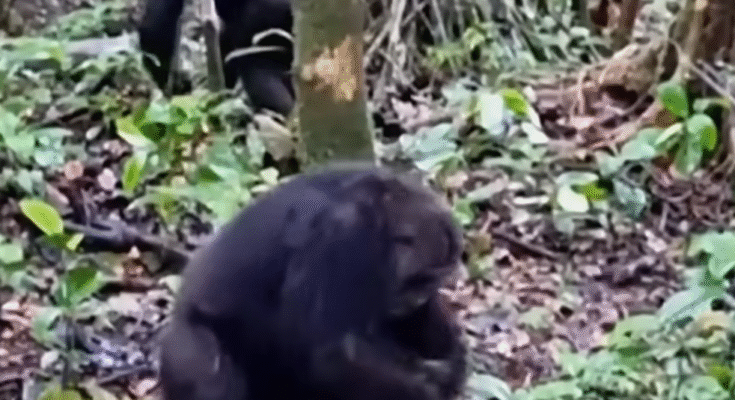 Deep within the dense forests of Africa, where the canopy is alive with birdsong and the air hums with the rhythm of nature, a dramatic and heartbreaking scene unfolds. A group of chimpanzees—intelligent, social, and strong—moves quietly through the trees. Their eyes are sharp, their gestures deliberate. Among them is a powerful male, the leader of the troop. He spots movement below: a small monkey foraging innocently on the forest floor. What happens next is a reminder that even in the most beautiful corners of nature, life and death are deeply intertwined.