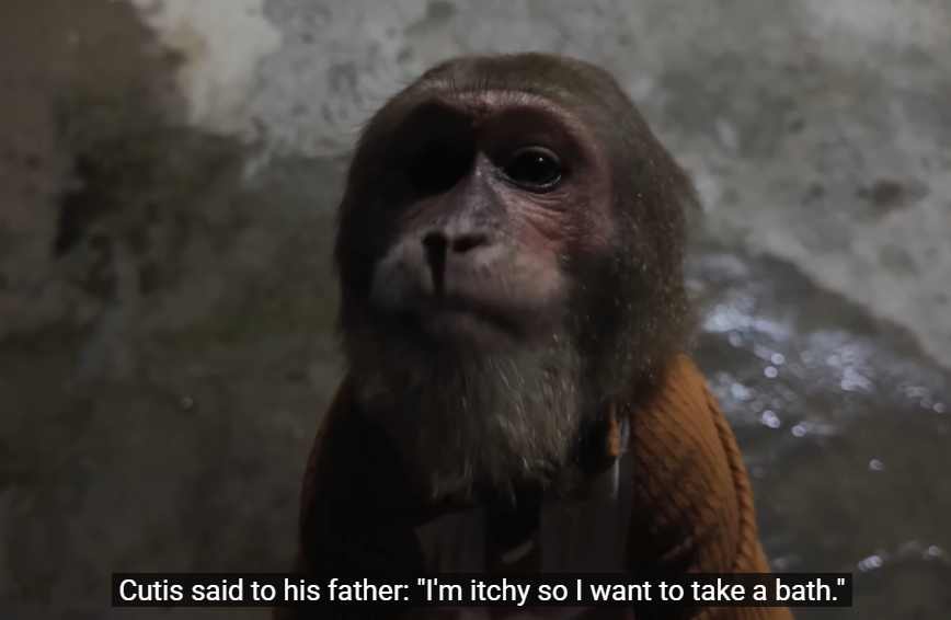 Still determined, CUTIS decided to continue the âbath mission.â He dipped the towel in water and began scrubbing Baby Monkeyâs fur like heâd seen Mom do. But instead of gentle strokes, CUTIS scrubbed so hard that Baby Monkey yelped, âOww! Too much!â