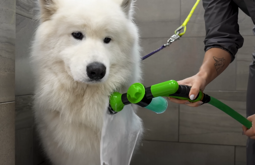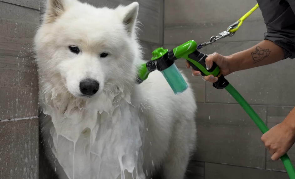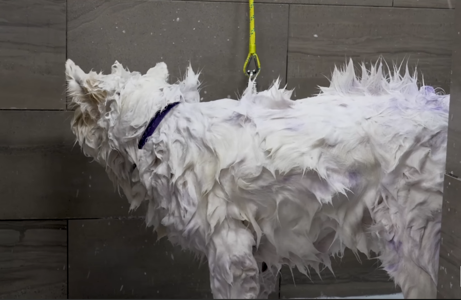The gentle spray washed through his coat, and Mia worked in a rich, moisturizing shampoo. The lather built up into creamy foam, covering Snowball’s fur until he looked like a giant marshmallow. His smile never faded.