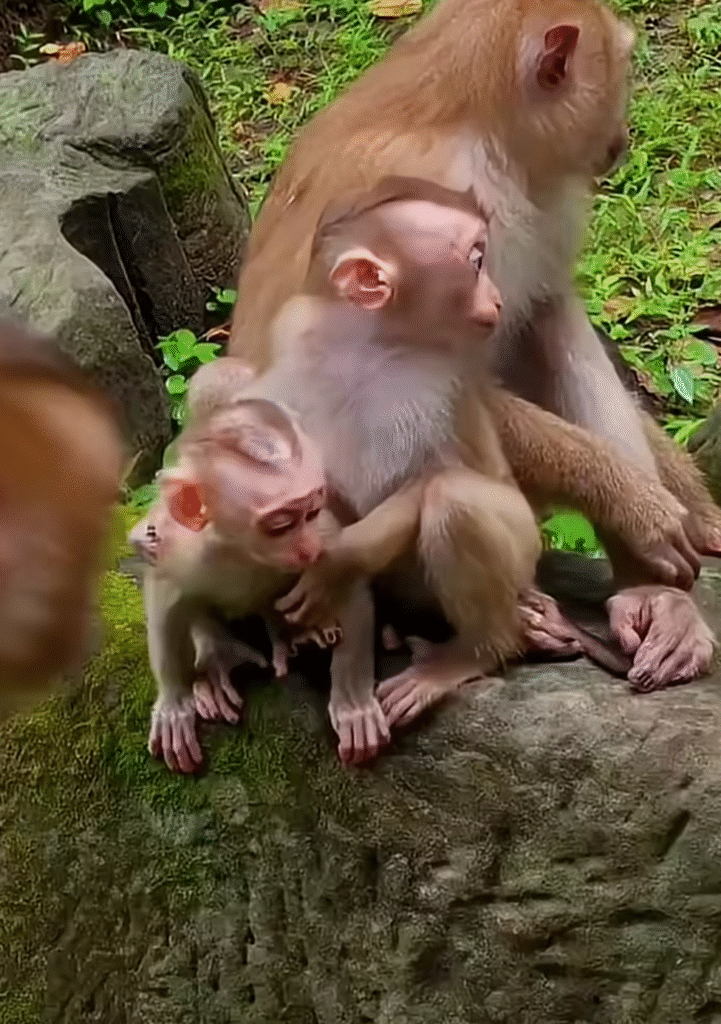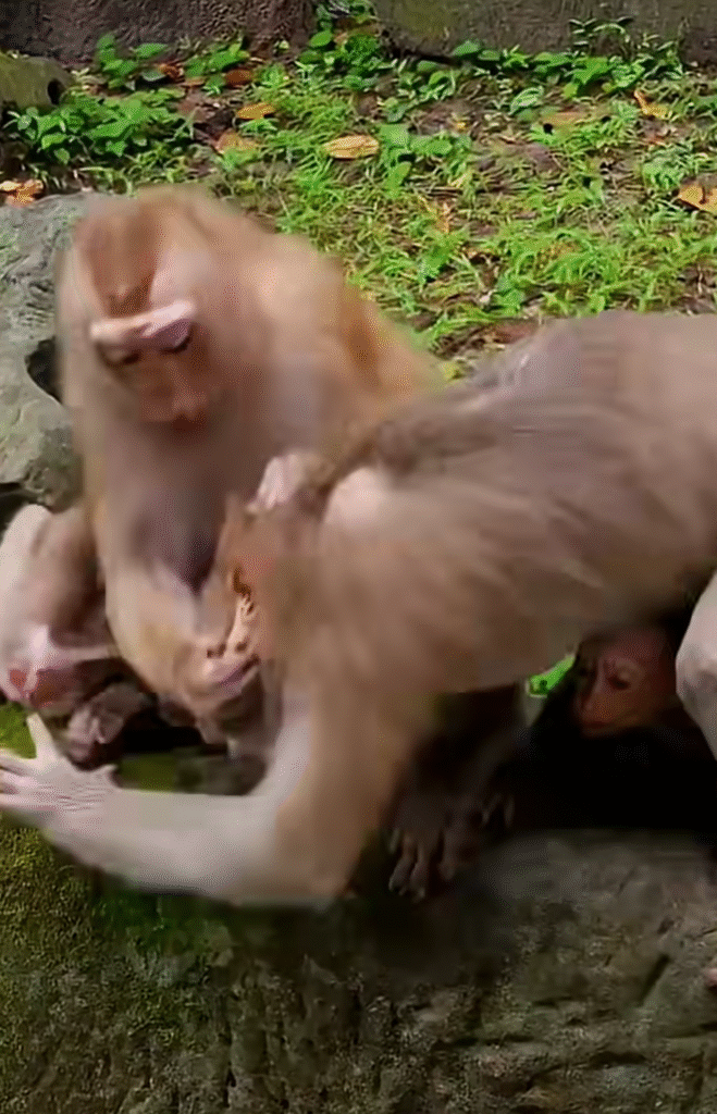 A mother monkey, frightened by the chaos, grabs her baby and darts to the side. Her heart pounds as she shields her infant from the battle. Another young monkey, too curious to understand danger, peeks from behind a tree, watching with wide eyes as the two alphas fight fiercely on the mossy rock.