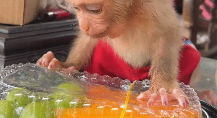 A mischievous grin spread across her face. Slowly, she crept closer to the pile of fruit, each step light as a feather. She extended one tiny hand and poked a banana gently. It was soft, ripe, and smelled heavenly. Xuxu sighed. “Just one sniff,” she whispered to herself.