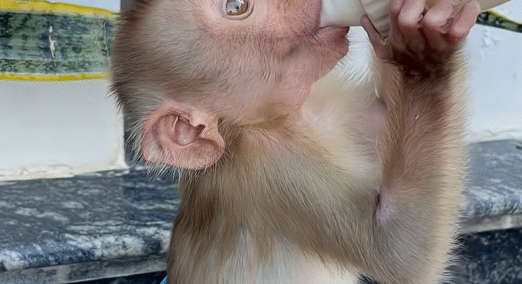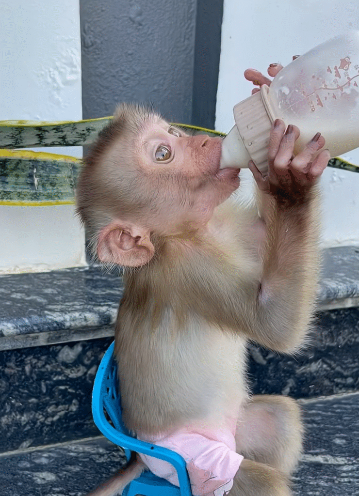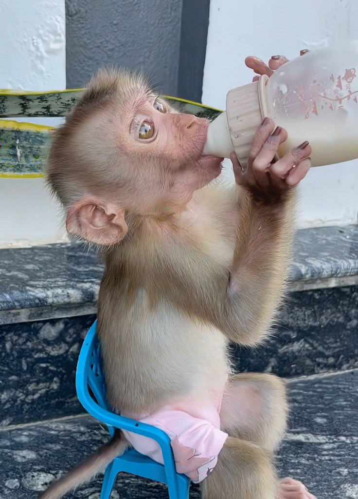 From the moment Mimi woke up each morning, his cuteness filled the air. He would yawn with his tiny mouth wide open, stretch his arms, and cling to his mother’s fur. The first thing he always wanted after waking up was his milk. His mother would sit on a branch, holding him close while he drank from his bottle. The way he wrapped his little hands around it, making soft sucking sounds — slurp, slurp, slurp — made everyone smile. His round tummy would wiggle a little as he drank, and sometimes he’d stop halfway just to giggle at the butterflies fluttering nearby.