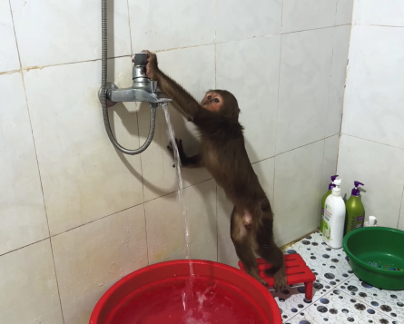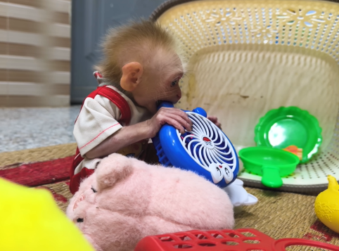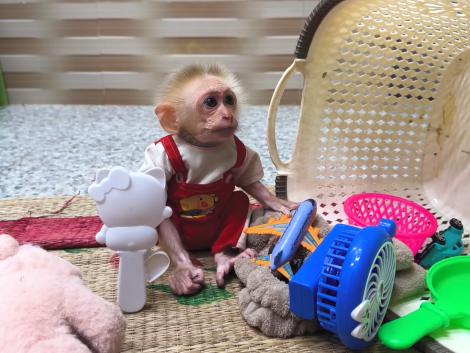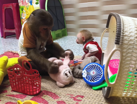 CUTIS, the smart and responsible monkey, had been helping Mom clean the backyard. The baby monkey, always curious and energetic, was playing nearby with a shiny little bell it found. The sound of the bell jingled through the yard as the baby jumped around, laughing and shaking it with delight.