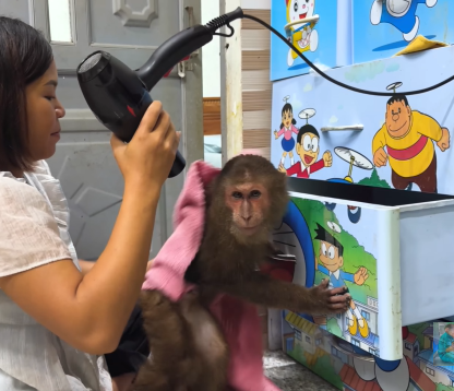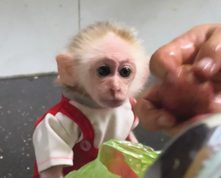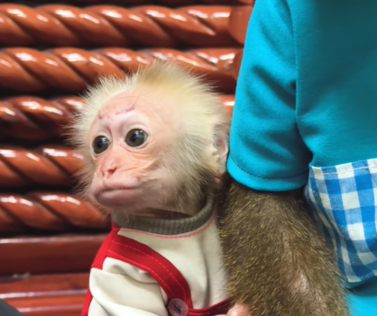 The baby monkey jumped onto his shoulder and whispered proudly, “My hero CUTIS!”