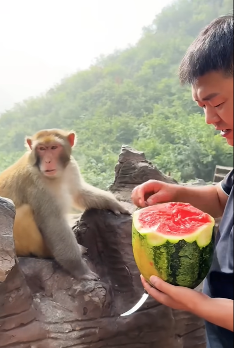 Monkeys’ love for watermelon often leads to hilarious interactions with humans. In many tourist spots, visitors bring fruit, hoping to feed or photograph monkeys. Cameras capture every comical moment: monkeys stealing fruit from hands, pretending to nibble but tossing pieces in the air, or climbing onto shoulders while eating.