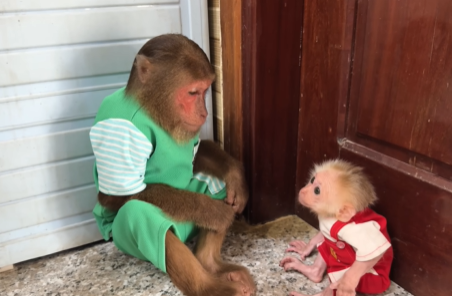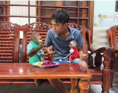 Meanwhile, the baby monkey was far less restrained. Fascinated by the odd behavior, it bounced up and down, squeaking loudly, and occasionally attempting to mimic Dad. The result was a chaotic mix of curiosity, imitation, and comedic timing.