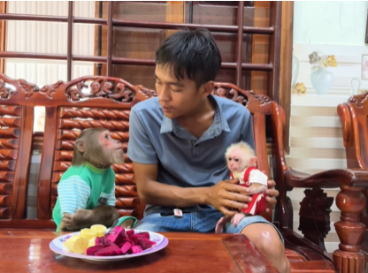 The baby monkey quickly escalated the mischief. Spotting a small fruit nearby, it grabbed it and tossed it toward Dad, who flinched dramatically. CUTIS squealed and leaped sideways, adding to the spectacle. Then, in a hilarious twist, the baby monkey attempted to hide behind CUTIS, only to pop out unexpectedly and squeak in Dad’s direction.