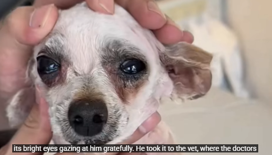 The dog lifted his head weakly, his eyes filled with fear and exhaustion. He tried to move away, but his legs gave out beneath him. His paw was bleeding — likely from walking too long on rough concrete — and his body was so thin she could feel the bones under his fur.