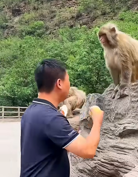 At first, he did it perfectly, but instead of placing it in the bowl, he took a bite and then passed it to another monkey — who immediately snatched it and ran. Cutis clapped his hands like he was proud of himself.