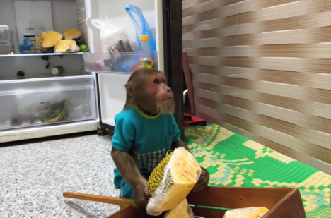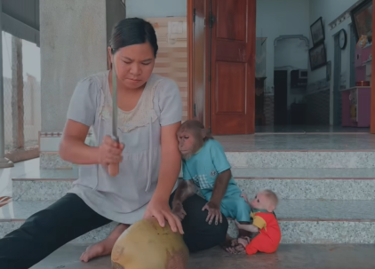While Mom was distracted, the baby monkey noticed CUTIS staring at the jackfruit, plotting his daring heist. Unable to contain its excitement—or perhaps driven by a desire to cause a little chaos—the baby scampered over to Mom and squeaked urgently, pointing toward the jackfruit.