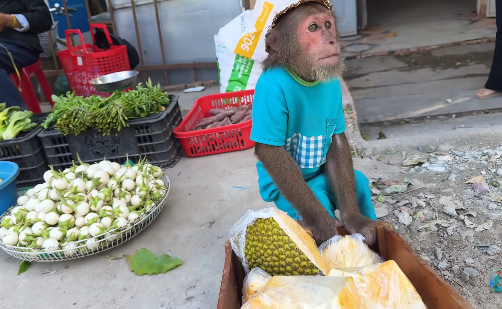 CUTIS squeaked approvingly, tapping the jackfruit in excitement. He backed away, ensuring the transaction went smoothly, while the baby monkey bounced on a nearby crate, cheering and squeaking as if announcing the great victory.