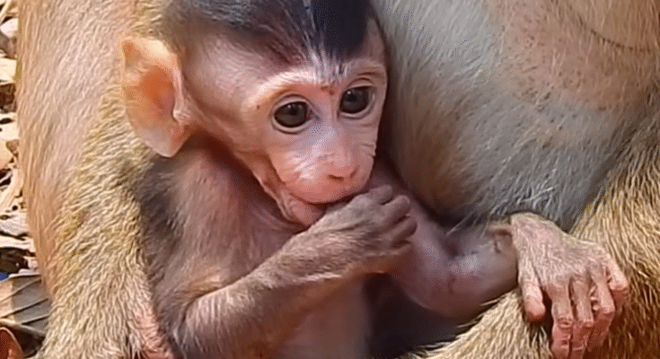 It was little Lulu — a tiny baby monkey with round brown eyes and fur as soft as silk. She had been separated from her mother, clinging tightly to a small wooden post near the hut where some villagers often gathered to feed animals. Her small body trembled as she called out in a series of pitiful whimpers, her voice cracking with each plea.