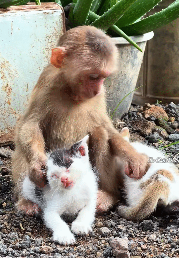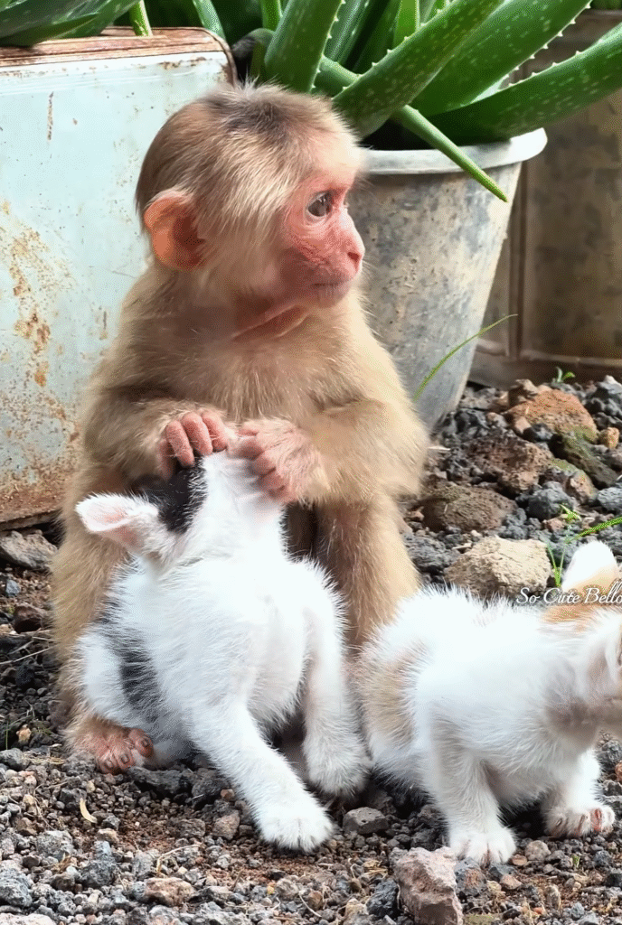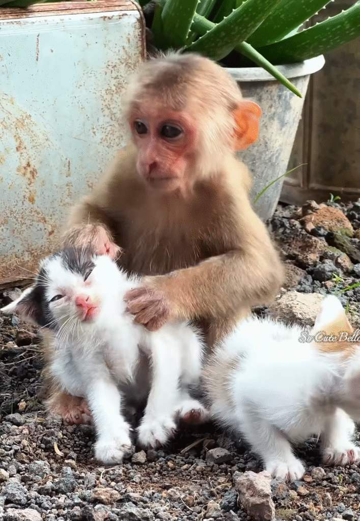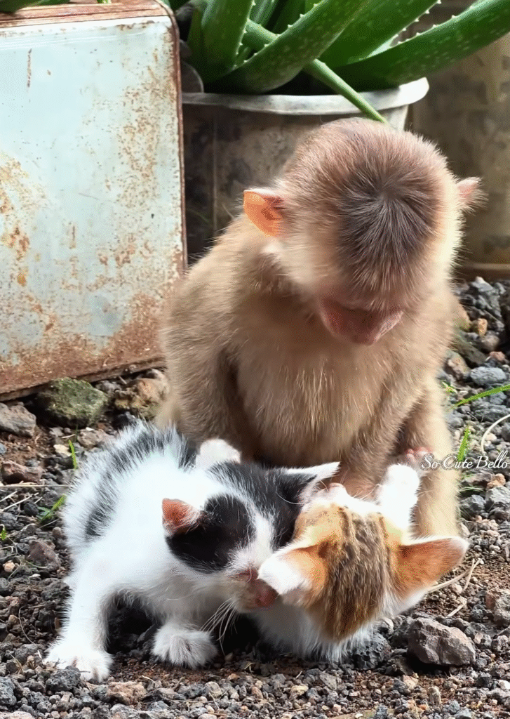 Yes, this was gentle friendship — a friendship pure and innocent, built on kindness and care. A baby monkey and two kittens, showing the world that love has no limits. ❤️🐒🐱🐱